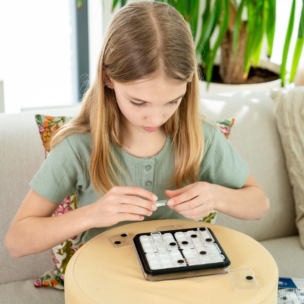 Περιεχόμενα: Ταμπλό παιχνιδιού με 4 πλευρές ζαριών, 12 διάφανα κομμάτια (8 με μαύρες κουκίδες και 4 κενά), βιβλιαράκι με 60 προκλήσεις και λύσεις.